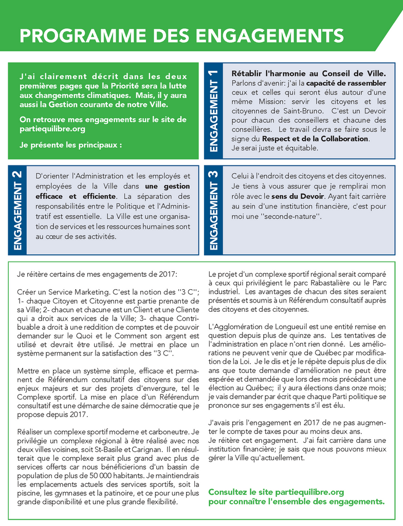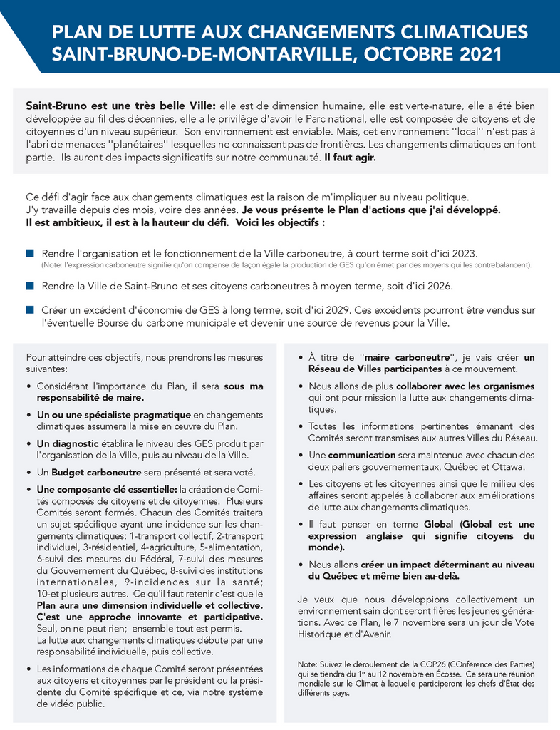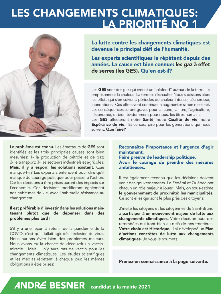 Changements climatiques : aux élections de 2021, j'ai établi que les Changements Climatiques devaient être une Priorité pour que Saint-Bruno devienne carboneutre. L'idée a été reprise par le président de l'Union des Municipalités du Québec (UMQ) lors de leur récent Congrès en mai, pour que les Changements Climatiques soient une priorité pour toutes les municipalités du Québec.